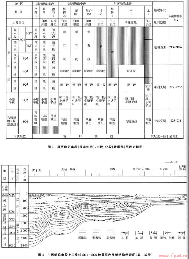 值得指出的是,大邑地區(qū)須三段底(即中國石化認為的T51界面)對下伏層的削截在大邑至灌口一帶十分明顯。由于龍門山構(gòu)造帶從NE→SW逐次抬升,須六、須五段依次遭剝蝕。川西坳陷的北、中、南段SQ1~SQ6層序?qū)Ρ热鐖D3所示[6];展示坳陷的中段、北段各層序均可對比。