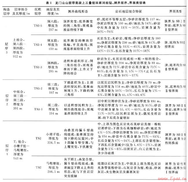 過去習慣上把上三疊統(tǒng)劃分為6段,其中一、三、五段為頁巖夾可采煤層的煤系地層,稱為富煤段;二、四、六段為砂巖,是富砂段也是含油氣的儲集層。據(jù)3條SBⅠ型層序界面劃分了3套構(gòu)造層序,據(jù)SBⅡ型層序界面和水泛面劃分了6套沉積層序(S01~S06),在層序內(nèi)識別了巖性轉(zhuǎn)換面,據(jù)此建立了上三疊統(tǒng)的層序地層剖面(圖1),須家河組各層序鉆、測井層序、界面類型見表1。