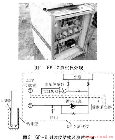 目前的測(cè)試裝置均是以擾動(dòng)-響應(yīng)的方式來(lái)推算地下的換熱情況和巖土體熱物性參數(shù)。本次試驗(yàn)的測(cè)試裝置是中國(guó)地質(zhì)大學(xué)(武漢)工程學(xué)院研制的GP系列測(cè)試儀(GP-2),測(cè)試儀外觀見圖1,測(cè)試儀結(jié)構(gòu)及測(cè)試原理見圖2。GP-2測(cè)試儀的測(cè)試原理:在鉆孔中埋設(shè)U型管并回填[4],使U型管與測(cè)試儀管路連接,形成一個(gè)閉合回路。在循環(huán)水泵的作用下,水通過(guò)電加熱器加熱升溫后進(jìn)入U(xiǎn)型管,將熱量傳遞給周圍的巖土體,最后流回到測(cè)試儀中。通過(guò)測(cè)試,獲得U型管的進(jìn)、出水溫度和流量,用以計(jì)算巖土體的熱物性參數(shù)。