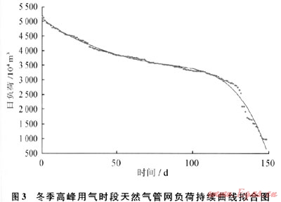 由圖2可知同一地區(qū)的天然氣管網(wǎng)負(fù)荷持續(xù)曲線具有相似性,為了研究極端天氣條件下的天然氣管網(wǎng)負(fù)荷特性,現(xiàn)取北京市2009年4月1日至2010年3月31日的天然氣管網(wǎng)負(fù)荷持續(xù)曲線,將夏季負(fù)荷截去后,留下冬季高峰用氣時(shí)段150d的負(fù)荷曲線,如圖3所示。對(duì)圖3中散點(diǎn)進(jìn)行數(shù)值擬合得到擬合多項(xiàng)式[6]: