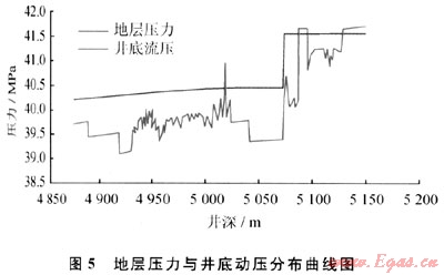 圖4所示的是某井在5087m處地層壓力測試所得產(chǎn)氣量與井底動壓的關(guān)系曲線。根據(jù)MWD實測資料,5087m處實測垂深為4105m,則可計算出地層壓力系數(shù)為1.034,回歸計算結(jié)果與完鉆測試解釋結(jié)果吻合。