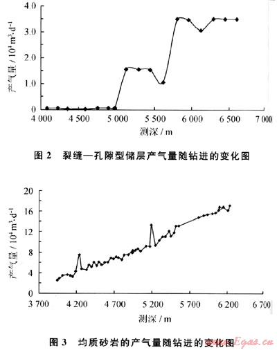 由于鉆遇裂縫和孔隙性基塊會有不同的產(chǎn)氣量顯示,根據(jù)隨鉆監(jiān)測的產(chǎn)氣量隨著井深變化特征,可以準確判斷地層的介質(zhì)類型及其供氣能力。圖2為鉆遇裂縫孔隙型儲層時的產(chǎn)氣隨鉆進變化規(guī)律,其氣體產(chǎn)量是隨每鉆遇一個裂縫(組)而上升一個臺階;圖3為鉆遇均質(zhì)砂巖型儲層時的產(chǎn)氣隨鉆進變化規(guī)律,其產(chǎn)氣量與鉆進深度幾乎呈直線變化關(guān)系。