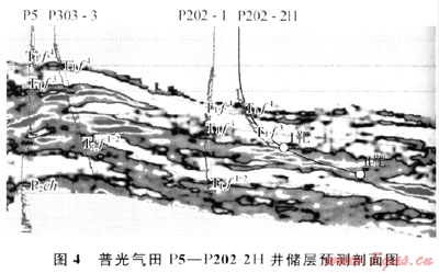 普光氣田目前已完鉆6口水平井,鉆遇氣層厚度介于398.6~623.5m之間,均達(dá)到或超過設(shè)計(jì)指標(biāo)。如P202-2H井,原為部署在P202井臺上的1口定向井,根據(jù)該井臺上P202-1井(直井)實(shí)施情況及儲層預(yù)測結(jié)果(圖4),該井區(qū)氣層厚度介于120~150m,且縱向上分布比較集中,適合打水平井,因而重新進(jìn)行了井型優(yōu)化。該井設(shè)計(jì)水平段長470m,鉆遇氣層厚度602m,比設(shè)計(jì)為斜井多鉆氣層400m。2009年5月,該井投產(chǎn)試氣,射開氣層558m,測試無阻流量686×104m3/d。
