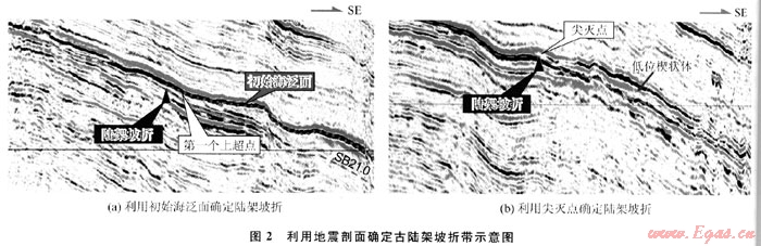 陸架坡折帶地形較為復(fù)雜,所以,確定陸架坡折點(diǎn)和范圍的方法非常重要。陸架坡折點(diǎn)為陸架最外緣坡度開始明顯變化的點(diǎn),它位于陸架與陸坡之間過渡帶的向陸點(diǎn)。古陸架坡折點(diǎn)的識(shí)別則更加困難,主要依賴于地震資料,是在確定了層序邊界的基礎(chǔ)上進(jìn)行的。可分為以下2種類型加以識(shí)別。