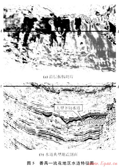 該區(qū)目前無鉆井鉆遇到該地質(zhì)體,但在該區(qū)東部,其水下水道的地震特征非常明顯:利用最新采集的3D地震資料,以精細(xì)的3D地震資料做基礎(chǔ),能夠清晰地觀察到水道的侵蝕、平面分布等特征。通過分析,發(fā)現(xiàn)了8條水道(圖5中①~⑧),自西向東依次排列,由北向南延伸,隨著坡度的逐漸減緩,在河道下方分別演化為扇狀朵體,并相互疊置(圖5-a)。這些水道在不同位置,其形態(tài)、寬度、長度都不同,但具有相似的地震相特征:地震同相軸呈點(diǎn)、段式反射,下切特征明顯,振幅中等-高(圖5-b)。通過這些水道下切形態(tài)、深度、地震反射特征和沉積厚度,可推測其形成于同一時(shí)期,且物源均來自于正北方向。