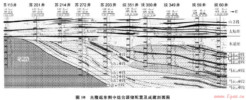 晚石炭世盆地整體沉降后,鄂爾多斯地區(qū)又開始接受石炭-二疊紀(jì)海陸交互相及陸相沉積,使上古生界的煤系地層在該區(qū)與奧陶系中組合及下組合地層直接接觸。到印支末燕山期,隨著上古生界煤系烴源巖熱演化成熟進(jìn)入烴類氣體的大量生成階段后,即可對下古生界的奧陶系中組合及下組合儲(chǔ)層供氣,構(gòu)成良好的源儲(chǔ)配置關(guān)系(圖10)。