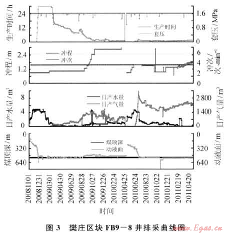 FB9-8井于2006年8月2日完鉆,完鉆井深585m。2008年6月27日壓裂3#煤層,壓裂井段523.8~528.8 m,厚度5.0 m,共注入活性水壓裂液356m3,石英砂30m3。2008年11月7日投產(chǎn),排采40d解吸見氣,最高日產(chǎn)氣量達(dá)到1746m3,產(chǎn)氣高峰時(shí)日產(chǎn)水0.8m3,維持138 d后日產(chǎn)氣量迅速下降至466m3,水量0.1m3。判斷為地層氣鎖及地層應(yīng)力閉合雙重影響,導(dǎo)致產(chǎn)量下降(圖3)。2010年5月1日進(jìn)行大規(guī)模壓裂解堵,措施后65d,產(chǎn)氣量增加至2400m3,截至目前已穩(wěn)產(chǎn)312d,累計(jì)增產(chǎn)氣約54×104m3。