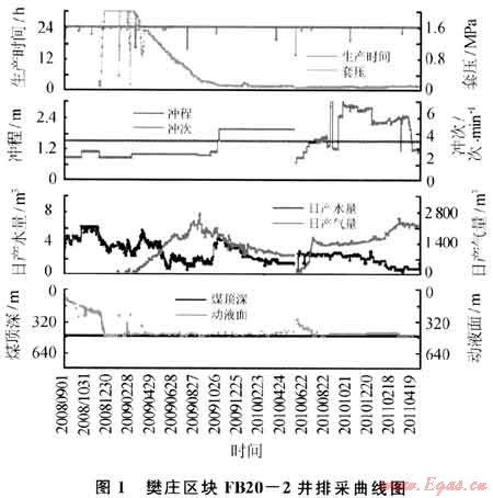 煤層氣井通過下套管固井、射孔壓裂完井后投入生產(chǎn),流體入井直接通道為射孔孔眼、井筒附近煤層壓裂破碎帶,由于煤層氣生產(chǎn)為低壓生產(chǎn),與常規(guī)油氣相比,該區(qū)域更容易被粉煤灰、泥漿、頂?shù)装迥鄮r、作業(yè)帶來入井內(nèi)的外來物質(zhì)等填充堵塞,即近井地帶污染堵塞,堵塞后煤層氣產(chǎn)量會(huì)快速遞減。用水力壓裂的方法可以解除近井地帶堵塞,而水力壓裂具有施工規(guī)模大,成本高,實(shí)施時(shí)間長(zhǎng),見效周期較長(zhǎng)等局限性。針對(duì)該類問題,2011年以來在樊莊區(qū)塊開展了運(yùn)用高能電脈沖技術(shù)解除近井地帶污染增產(chǎn)試驗(yàn)。其基本原理是運(yùn)用高壓放電技術(shù)作用煤層氣井內(nèi)液體,使其產(chǎn)生強(qiáng)大的沖擊波,在近井地帶產(chǎn)生的壓力脈沖將井筒附近的地層污染解開[6]。該措施具有作業(yè)周期短、成本相對(duì)低等優(yōu)勢(shì),但也具有脈沖壓力波及范圍小、對(duì)選井條件判別要求高等局限性。