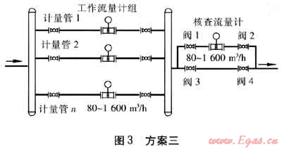 ③ 城市天然氣門站計量系統(tǒng)的設(shè)計方案還要充分考慮城市經(jīng)濟發(fā)展對天然氣供氣設(shè)備擴容的需求。如果選用渦輪流量計或超聲流量計作為工作流量計,則應該考慮在圖3方案三的工作流量計組中預留擴展旁路。如果選用標準孔板流量計作為工作流量計,這種流量計在雷諾數(shù)符合要求的前提下,可以通過擴大開孔直徑、調(diào)整差壓上限等方法,在一定范圍內(nèi)解決擴容的問題。