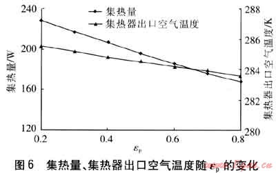 保持其他參數(shù)不變,集熱量、集熱器出口空氣溫度隨εp的變化見圖6。由圖6可知,隨著εp增大,吸熱板對環(huán)境的輻射傳熱增強,熱損失增大,集熱量降低。由于吸熱板溫度降低,與空氣的對流傳熱減弱,因此集熱器出口空氣溫度降低。集熱量與集熱器出口空氣溫度降低的趨勢逐漸減緩,這是由于隨著吸熱板溫度的降低,熱損失的增長率也大大降低。