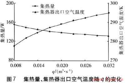 保持其他參數(shù)不變,集熱量、集熱器出口空氣溫度隨q的變化見圖7。由圖7可知,隨著q的增大,集熱器出口空氣溫度降低,這是由于q的增大易導致空氣穿過吸熱板的時間和在集熱器內部流動的時間縮短,影響了換熱效果。然而,集熱量一方面取決于集熱器出口空氣溫度與環(huán)境溫度之差,另一方面取決于q。由圖7可知,當q增大時,集熱器出口空氣溫度降低幅度較小,此時q成為影響集熱量的決定因素。因此隨q的增大,集熱量逐漸升高。但在集熱器出口空氣溫度逐漸減小的影響下,集熱量的增長速率是逐漸減緩的。