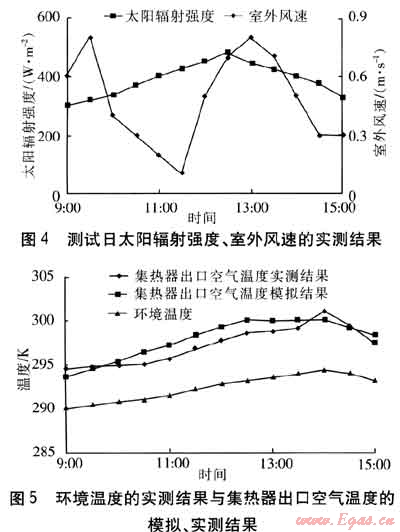 選取2009年10月初天氣晴好的一天作為測試日,測試時間為9:00—15:00。測試日太陽輻射強度、室外風速的實測結果見圖4。環(huán)境溫度的實測結果與集熱器出口空氣溫度的模擬、實測結果見圖5。