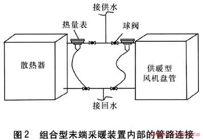實驗室1窗戶下面的散熱器管路上裝有熱量表、球閥及供暖型風機盤管。設備連接見圖2,維持基礎室溫的散熱器和風機盤管并聯(lián)。