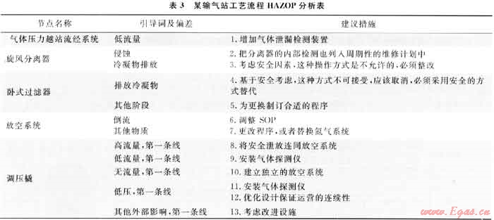 采用HAZOP法對(duì)某輸氣站的工藝流程進(jìn)行了全面的危險(xiǎn)辨識(shí),將該站的工藝流程劃分為8個(gè)分析節(jié)點(diǎn),共考慮了78個(gè)偏差,形成了13條建議(表3)、24項(xiàng)跟蹤任務(wù)[6]。