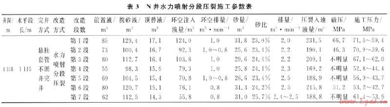 該井7段水力噴射分段壓裂,累計加砂量201.7m3,累計環(huán)空注入液量602.1m3,壓裂注入液量1393.4m3,一點法測得無阻流量21.1187×104m3/d,是鄰井直井無阻流量的3.63倍,改造效果較好。具體施工參數(shù)如表3所示。