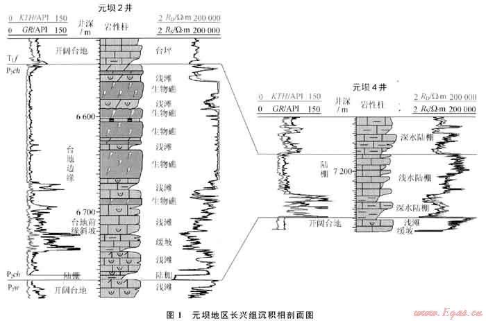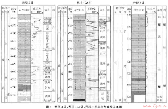如元壩2井、元壩101井、元壩102井均在長興組頂部發(fā)育了一套局限渴湖沉積環(huán)境中的同生期混合水白云巖,其下部地層溶蝕作用較強,溶蝕孔隙發(fā)育,測井解釋的孔隙度為4%~12%(圖4),形成了一套較好的儲層,測試獲得高產(chǎn)天然氣硫。而元壩4井,由于在長興組頂部未發(fā)育該套白云巖,其下部溶蝕作用弱,溶蝕孔隙不發(fā)育,測井解釋的孔隙度小于2%(圖4),未鉆遇儲層。