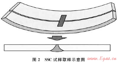 硫化物應(yīng)力開裂(SSC)試件尺寸:115×15×5(5為壁厚方向)(mm),焊接接頭試樣垂直于焊縫取樣,焊縫位于試樣中部。對(duì)于焊接管,應(yīng)從焊縫、沿焊縫90°、180°部位取樣。以內(nèi)壁為基準(zhǔn)取5mm厚的試樣,圖2為SSC試件取樣示意圖。