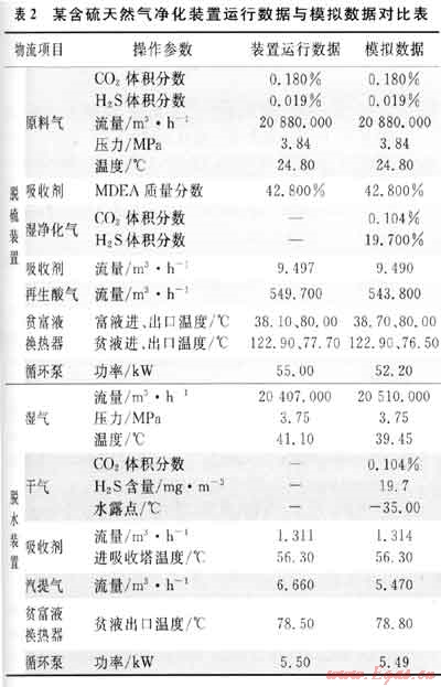 依據(jù)該含硫天然氣凈化裝置的運(yùn)行數(shù)據(jù),將原料氣及MDEA吸收溶液的參數(shù)輸入凈化裝置工藝模型,調(diào)整模型參數(shù),使輸出干氣氣質(zhì)達(dá)到凈化氣氣質(zhì)標(biāo)準(zhǔn)。表2為某含硫天然氣凈化裝置運(yùn)行數(shù)據(jù)與模擬數(shù)據(jù)對(duì)比表,據(jù)此來(lái)驗(yàn)證所建立的凈化裝置模型的準(zhǔn)確性。