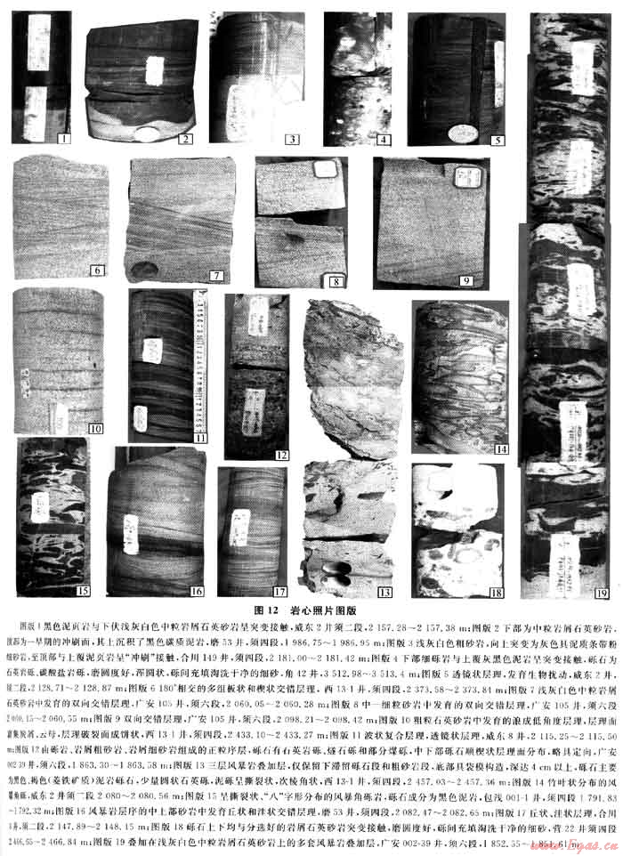 元壩、廣安、南充、合川地區(qū)各段巖心中均見風(fēng)暴巖,重慶代家溝露頭等也見風(fēng)暴巖沉積。據(jù)觀察總結(jié),研究區(qū)風(fēng)暴巖有疊加在濱淺湖砂壩上、分布于淺湖泥及壩后沼澤中3種分布形式。疊加在濱淺湖砂壩上的風(fēng)暴巖反映了較強的風(fēng)暴浪作用,風(fēng)暴巖層底面對下伏淺灰色巖屑石英砂巖強烈沖刷,有的可形成袋模構(gòu)造(圖12-13)。下部的滯積礫石大多數(shù)為撕裂狀或竹葉狀或具塑性變形的泥巖礫、煤礫、碳質(zhì)泥巖礫或粉細砂巖礫,礫石呈“八”字形排列或雜亂分布(圖12-14~15)。向上砂巖略顯平行層理或出現(xiàn)丘、洼狀交錯層理(圖12-16~17)。由于多次風(fēng)暴作用,往往形成不完整的風(fēng)暴巖疊置層序(圖12-19)。風(fēng)暴巖不會出現(xiàn)在河流環(huán)境,在海洋和湖泊環(huán)境(特別是大湖)是極常見的。