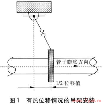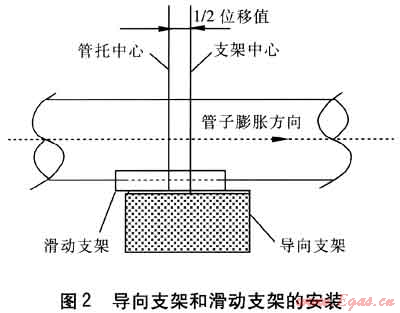 ⑥ 管道波紋管補償器在安裝前要按照使用說明進行預(yù)拉伸,安裝方向要與氣流流動方向一致且水平安裝。安裝波紋管補償器時,應(yīng)設(shè)臨時約束裝置,待管道安裝固定后再拆除臨時約束裝置。管道安裝時,應(yīng)及時固定和調(diào)整支、吊架。支、吊架位置應(yīng)準確,安裝應(yīng)平整牢固,與管道接觸應(yīng)緊密。有熱位移的管道,吊點應(yīng)設(shè)在位移的相反方向,按位移值的1/2偏位安裝(見圖1)。固定支架應(yīng)按設(shè)計文件要求安裝,并應(yīng)在補償器預(yù)拉伸之前固定。導(dǎo)向支架或滑動支架的滑動面應(yīng)潔凈平整,不得有歪斜和卡澀現(xiàn)象。導(dǎo)向支架和滑動支架的安裝位置應(yīng)從支承面中心向位移反方向偏移,偏移量應(yīng)為位移值的1/2(見圖2)。