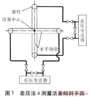 差壓法a測量活塞傾斜平面見圖1。在活塞上采用鋼管做兩個大的水平尺,互相垂直異面交叉,不連通,交叉點為活塞的中心位置。鋼管內(nèi)充有低揮發(fā)性的專用油品,每根鋼管兩端各有一個立管,管內(nèi)充有一定高度的液注,同一根鋼管的兩個立管下部分別與差壓變送器的正負壓室相連,根據(jù)液柱高差,可計算得出該方向傾斜量的大小。差壓變送器鄰近測壓點安裝。