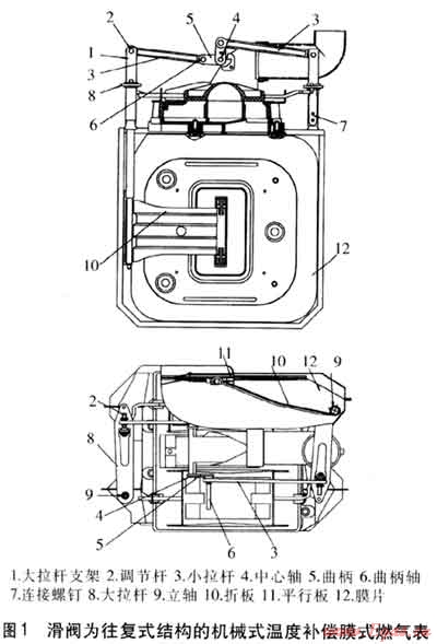 滑閥為往復(fù)式結(jié)構(gòu)的機(jī)械式溫度補(bǔ)償膜式燃?xì)獗硎莻鹘y(tǒng)式結(jié)構(gòu),體積較大,見(jiàn)圖1。