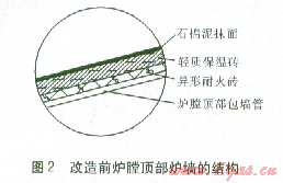 在運(yùn)行過(guò)程中,由于高爐煤氣的產(chǎn)量不穩(wěn)定,壓力較低,燃燒器出現(xiàn)數(shù)次熄火。不久,現(xiàn)場(chǎng)運(yùn)行人員在爐膛頂部爐墻發(fā)現(xiàn)幾處裂縫?,F(xiàn)場(chǎng)檢查后發(fā)現(xiàn),爐膛頂部的包墻管為單根光管結(jié)構(gòu),耐火層采用異形耐火磚敷設(shè),絕熱層采用輕質(zhì)保溫磚,最外層用石棉泥抹面密封,改造前爐膛頂部爐墻的結(jié)構(gòu)見(jiàn)圖2。