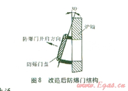 改造前后的防爆門(mén)結(jié)構(gòu)分別見(jiàn)圖7、8。改造前防爆門(mén)蓋與豎直爐墻的夾角為70°。由力學(xué)分析可知,防爆門(mén)蓋與豎直爐墻的夾角越大,需要的開(kāi)啟力量就越大[3]。改造前防爆門(mén)蓋與豎直爐墻的夾角為70°,防爆門(mén)開(kāi)啟需要的力很大。為解決防爆門(mén)開(kāi)啟力大的問(wèn)題,對(duì)原有防爆門(mén)進(jìn)行改造,改造后防爆門(mén)蓋與豎直爐墻的夾角變?yōu)?0°,這樣防爆門(mén)需要的開(kāi)啟力就減小很多,爐內(nèi)壓力突然升高時(shí)可以迅速開(kāi)啟泄壓,有效地防止?fàn)t內(nèi)壓力突然升高對(duì)尾部煙道頂部爐墻造成破壞。