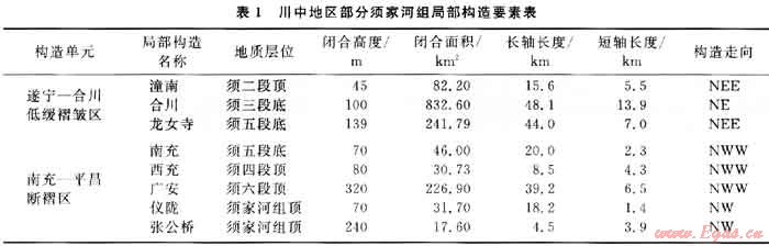 盆地中部的川中地區(qū),包括平昌以南、華鎣山以西、內(nèi)江以北、龍泉山-梓潼以東地區(qū)。須家河組構(gòu)造總體表現(xiàn)為向北、向西傾伏的區(qū)域單斜,構(gòu)造平緩,變形較弱,斷距較大的斷層不發(fā)育,以低幅度局部構(gòu)造為主。