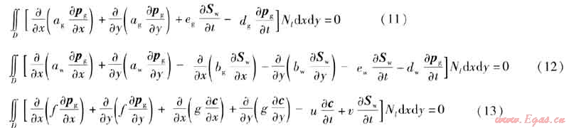 本文討論的是非穩(wěn)態(tài)的氣水滲流、氣氣擴散問題,各參數(shù)不僅是空間域的函數(shù),而且是時間域的函數(shù),因此建立有限元方程時采用部分離散的方法[7]。對空間域的離散采用Galerkin有限元方法,對時間域的離散采用有限差分法,把型函數(shù)僅表示成空間坐標的函數(shù),而節(jié)點的函數(shù)值則是時間t的函數(shù)。G表示一個有界的可度量幾何形體,在此表示積分區(qū)域。當G為平面有界閉區(qū)域時,記為D;格林公式中,當G為空間有限曲線段時,記為Γ。
