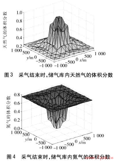 之后開始向儲氣庫注入天然氣,運行到第116天時,累積注入量(10022400m3)約達到目標注氣量,停止注氣。天然氣注入結(jié)束時,儲氣庫內(nèi)天然氣及氮氣的體積分數(shù)見圖1、2。由圖1、2可知,隨著天然氣的注入,天然氣逐漸將氮氣向周圍驅(qū)開,因而注采井周圍區(qū)域為純天然氣區(qū);由于氣體擴散,天然氣與氮氣相互摻混,因而從注采井逐漸向外,天然氣的體積分數(shù)逐漸減小,氮氣的體積分數(shù)逐漸增大,形成天然氣與氮氣的混合帶;再逐漸向外,為純氮氣區(qū)。