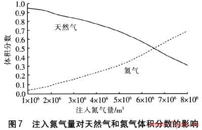注入氮氣量對采出氣中天然氣和氮氣體積分數(shù)的影響見圖7。由圖7可知,初始建庫時注入的氮氣量越多,在后期注采天然氣的過程中,與天然氣混合的氮氣量越多,從而導致采出氣中氮氣量越多。而在儲氣庫建設(shè)時,為了更大地節(jié)省投資費用,氮氣的注入量應(yīng)該是越多越好。因此,必須確定合理的注入氮氣量,使在不影響采出氣質(zhì)量的情況下,注入更多的氮氣以節(jié)省投資費用。