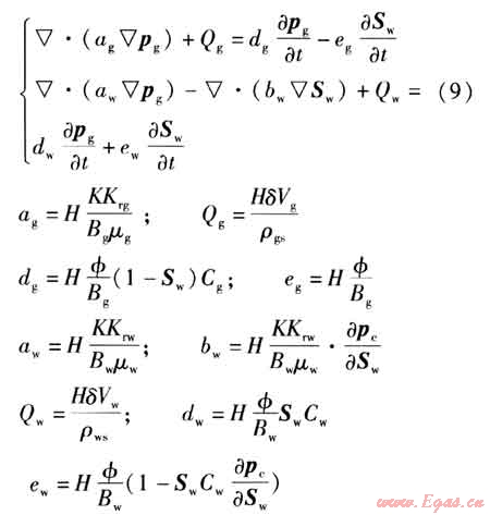 將氣水滲流連續(xù)性方程、運動方程、氣體狀態(tài)方程、飽和度平衡方程以及毛管壓力方程整理后,得到氣水兩相滲流方程為: