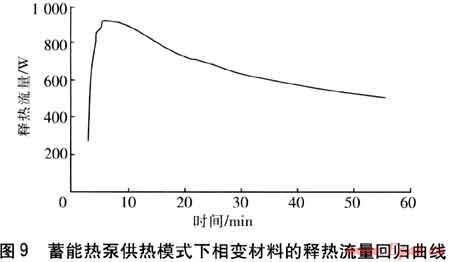 將圖8中的Φc與P相減,得到蓄能熱泵供熱模式下相變材料的釋熱流量,回歸曲線見(jiàn)圖9。由于前2min實(shí)驗(yàn)數(shù)據(jù)不穩(wěn)定且存在Φc<P的情況,因此曲線從第2min給出。與圖7比較,在蓄能熱泵供熱模式運(yùn)行56min后,制冷系統(tǒng)取走了儲(chǔ)存在相變材料中94.6%的熱量。