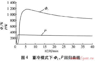 由實(shí)驗(yàn)結(jié)果擬合的蓄冷模式下Φc、P回歸曲線見(jiàn)圖4。由圖4可知,在壓縮機(jī)開(kāi)機(jī)的第1min,由于制冷循環(huán)剛開(kāi)始,而且換熱過(guò)程也需要消耗時(shí)間,因此換熱器進(jìn)出水溫度相差不大,Φc也很小。在運(yùn)行過(guò)程中P隨著冷凝壓力、蒸發(fā)壓力的下降而逐漸降低。
