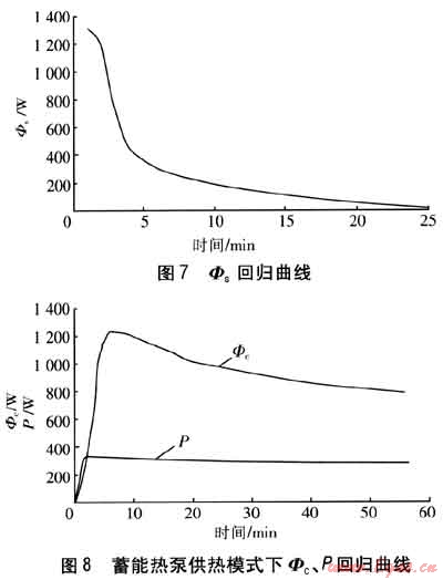 由實(shí)驗(yàn)結(jié)果擬合的蓄能熱泵供熱模式下Φc、P回歸曲線見(jiàn)圖8。與蓄冷模式相比較,由于冷凝溫度的升高,壓縮機(jī)的功率增大。Φc的變化趨勢(shì)與蓄冷模式類似,但是由于初始溫度高于蓄冷模式,相變材料相應(yīng)可提取的液態(tài)顯熱量增加。因此,蓄能熱泵供熱模式在達(dá)到與蓄冷模式相同的蒸發(fā)壓力水平時(shí),所用時(shí)間相應(yīng)延長(zhǎng)。