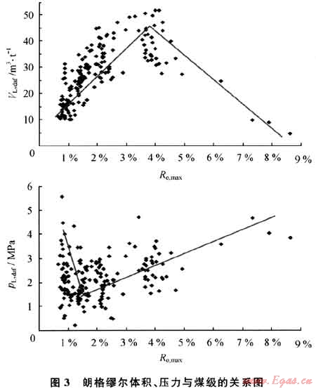 2) 華北地區(qū)石炭 二疊系各煤類(lèi)朗格繆爾體積與煤級(jí)的關(guān)系呈現(xiàn)出兩段式變化模式,即煤化程度在Ro,max<4%之前,VL,daf隨Ro,max的增加而增大,當(dāng)Ro,max>4%后,VL,daf隨Ro,max的增加而減少;朗格繆爾壓力與煤級(jí)關(guān)系復(fù)雜,數(shù)據(jù)十分離散。