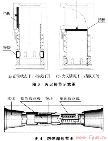 滅火短節(jié)(見圖3、圖4),即鉆柱防火接頭,這是一種低熔點合金制造的閥件,即滅火浮閥,閥內(nèi)裝有一個鋅環(huán)。在正常情況下,循環(huán)的空氣流動壓力使彈簧瓣向下張開,允許空氣循環(huán)通過。一旦環(huán)空著火,溫度上升,當(dāng)超過設(shè)計溫度時,低熔點合金鋅環(huán)熔化使一個襯套封住空氣流道,關(guān)閉閥門,停止向井底循環(huán)補充空氣,從而切斷氣源使火熄滅。