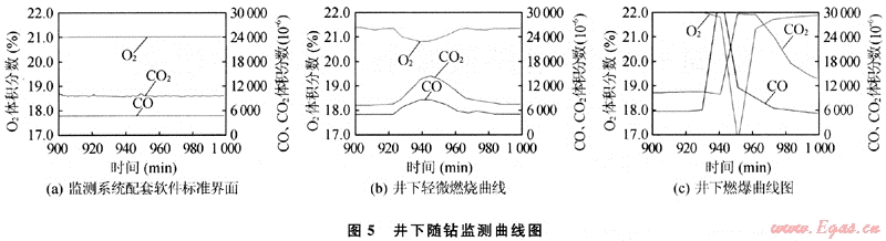 井下隨鉆監(jiān)測系統(tǒng)是專門為監(jiān)測井下燃爆現(xiàn)象而開發(fā)研制的。目前,在現(xiàn)場使用比較成熟的是西南石油大學(xué)研制的UBD氣體監(jiān)測系統(tǒng),其主要原理是在監(jiān)測到烴類氣體的情況下,通過對返出氣體中O2、CO2、和CO體積分?jǐn)?shù)變化的監(jiān)測來判斷井下是否發(fā)生燃爆。一旦發(fā)生井下燃爆,由于井下燃燒為不完全燃燒,返出氣體中的CO2、CO氣體體積分?jǐn)?shù)會升高,而O2氣體體積分?jǐn)?shù)會降低。圖5是3種情況下監(jiān)測界面圖的對比[2]。