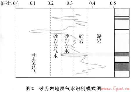 圖2表明,泊松比最低對應(yīng)氣;泊松比次低對應(yīng)氣水;泊松比中等對應(yīng)水;泊松比中高對應(yīng)砂巖致密層;泊松比很高對應(yīng)泥巖層。模式中泊松比值的大小具有相對性,即在不同儲(chǔ)層中,其值的分布范圍及劃分界限可能有所不同。碳酸鹽巖地層(石灰?guī)r及白云巖為主)具有相似的模式,只是巖性和泊松比值大小有區(qū)別。