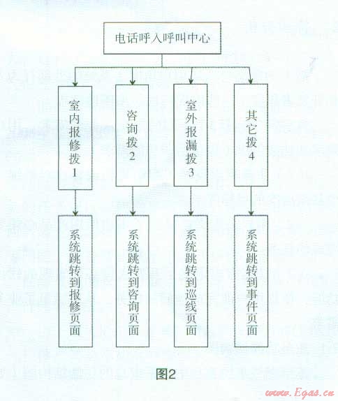 系統(tǒng)數(shù)據(jù)接口采用三層B/S結(jié)構(gòu),通過構(gòu)建應(yīng)用服務(wù)器,把呼叫中心的數(shù)據(jù)流與燃氣公司營業(yè)客戶系統(tǒng)、報修客服系統(tǒng)結(jié)合起來,充分利用了已有系統(tǒng)標(biāo)準(zhǔn)的數(shù)據(jù)接口,實現(xiàn)對后臺數(shù)據(jù)庫的訪問。與既有業(yè)務(wù)系統(tǒng)接口,融合后臺辦公自動化和T.作流系統(tǒng),系統(tǒng)可以向既有業(yè)務(wù)系統(tǒng)提交業(yè)務(wù)服務(wù)請求,也可以取得既有業(yè)務(wù)的數(shù)據(jù)。如煤氣費查詢、欠費信息等(可根據(jù)用戶欠費情況要求用戶先交費再維修,維護了公司利益)。系統(tǒng)聯(lián)通了呼叫中心座席人員、營業(yè)廳收費人員、抄表班業(yè)務(wù)員、工程管理人員與公司管理人員等各種角色使用系統(tǒng)的界面,使各類人員都能查詢到自己所需的數(shù)據(jù)。