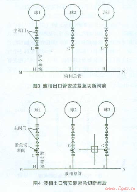 根據(jù)《氣瓶安全監(jiān)察規(guī)定》:《氣瓶充裝許可證》的有效期為4年;有效期滿前,氣瓶充裝單位應(yīng)當向原審批部門申請更換《氣瓶充裝許可證》。我公司的液化石油氣儲灌站于2011年7月向河北省質(zhì)監(jiān)局提出《氣瓶充裝許可證》的換證申請;河北省特種設(shè)備學(xué)會于2011年11月對液化石油氣儲灌站進行了現(xiàn)場評審。評審專家根據(jù)新版《城鎮(zhèn)燃氣設(shè)計規(guī)范》中關(guān)于對“液化石油氣儲罐上安全閥件的配置”,要求我液化石油氣儲灌站3座400m,的液化石油氣球罐的氣相管和液相出口管上的根部主閥門下加裝緊急切斷閥。