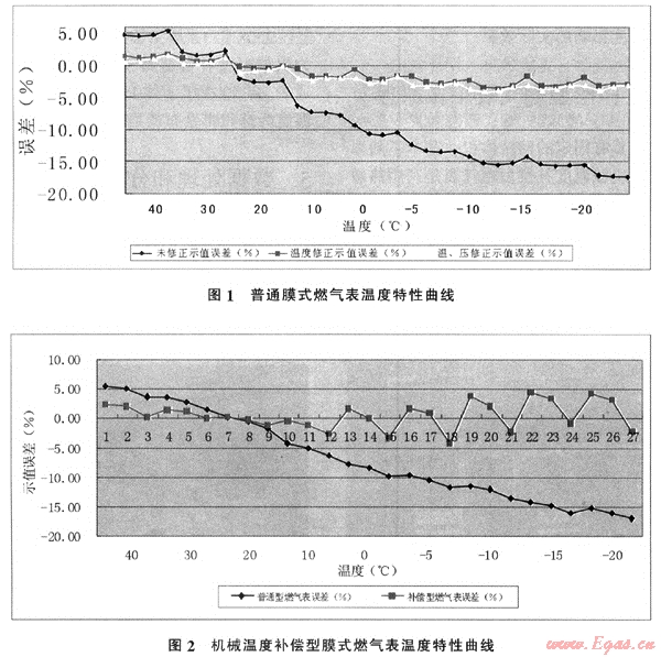為配合鄭州燃?xì)鈱嵤敉鈷毂戆惭b方式,我們在實驗室對膜式燃?xì)獗磉M(jìn)行了兩項重點實驗研究:一是研究環(huán)境溫度對普通膜式燃?xì)獗碛嬃啃阅艿挠绊?,二是研究機(jī)械溫度補償型燃?xì)獗碓趯嶒炇抑械难a償效果。實驗結(jié)果表明:普通膜式燃?xì)獗硎墉h(huán)境溫度影響較大,隨著環(huán)境溫度的下降,儀表的未修正示值誤差呈單邊下降的趨勢。在-10℃時,最大誤差可達(dá)到-10%~-15%,見圖1。機(jī)械溫度補償型燃?xì)獗砜梢詫崿F(xiàn)對環(huán)境溫度的修正補償,示值誤差基本可以修正到±5%以內(nèi),在低溫狀態(tài)下,補償效果尤為明顯,見圖2。