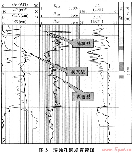 小型溶洞及溶孔在測井曲線上特征不太明顯,只在溶蝕孔洞發(fā)育段表現(xiàn)為深淺側(cè)向電阻率曲線顯示較低的電阻率值,且出現(xiàn)正幅度差,即深側(cè)向電阻率值大于淺側(cè)向電阻率值,自然伽馬比純石巖段略高;聲波時差和中子測井值增大,密度測井值降低,并有擴徑現(xiàn)象。在巖心和薄片上較易觀察。也可以用微電阻率成像測井(FMI)來進行觀察。