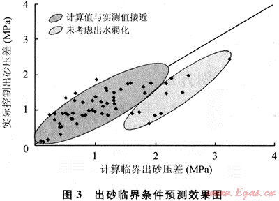 從圖3可以看出,25%的井的臨界壓差計(jì)算結(jié)果與實(shí)際出砂壓差偏差較大,分析其原因,這些井的實(shí)際生產(chǎn)壓差都較高,出水較多。氣井在開采過程中的出水將導(dǎo)致地層強(qiáng)度減弱,降低出砂的臨界壓差,使地層更容易出砂。