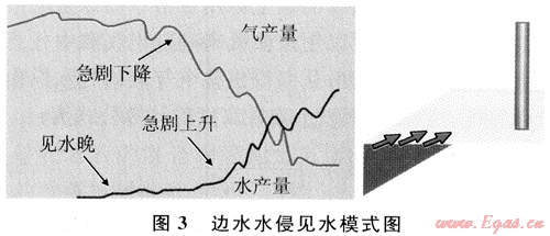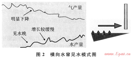 層間壓差導(dǎo)致層間水首先沿縱向侵入到相鄰層,然后再在層內(nèi)推動(dòng)下沿平面高滲透條帶或水平微裂縫橫向推進(jìn)到氣井(圖2)。由于水進(jìn)路線長(zhǎng),氣井出水通常較晚,但一旦見(jiàn)水,出水量將持續(xù)增加,產(chǎn)氣量明顯下降。