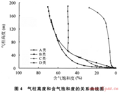 毛細(xì)管力曲線與地下流體飽和度具有函數(shù)關(guān)系,而自由水面以上的氣液柱高度又是由毛細(xì)管力決定的,因此,地下流體飽和度也是自由水面以上氣液柱高度的函數(shù),氣柱高度等于自由水面以上氣液柱高度減去靜水壓力對(duì)應(yīng)的自由水面以上液柱高度。據(jù)此,利用澀北疏松砂巖氣藏4類(lèi)典型的毛細(xì)管力曲線,就可以計(jì)算得出氣柱高度和含氣飽和度之間的關(guān)系曲線(圖4)。
