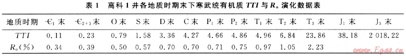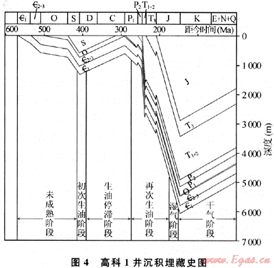 根據(jù)高科1井的沉積埋藏史圖(圖4)可見,樂山-龍女寺古隆起區(qū)下寒武統(tǒng)源巖經(jīng)歷了埋藏-抬升(剝蝕)-再埋藏-再抬升的演化過程。其有機(jī)質(zhì)生烴史可分為三期:第一期為初始生烴階段:高科1井下寒武統(tǒng)源巖在志留紀(jì)末R。值已達(dá)0.7%,處于未成熟一低成熟生烴期;第二期為生烴停滯階段,由于加里東運動的抬升作用,該井下寒武統(tǒng)源巖埋深變淺并遭受剝蝕,古地溫降低,有機(jī)質(zhì)進(jìn)入生烴滯流階段;第三期為“二次生烴”階段:從二疊系開始至二疊系末,下寒武統(tǒng)源巖埋藏深度及其所具有的古地溫已超過了初始生烴階段,源巖進(jìn)入了二次生烴階段。此時,高科1井毛。源巖Ro值已達(dá)0.71%,有機(jī)質(zhì)開始繼續(xù)生烴。印支末期,高科1井