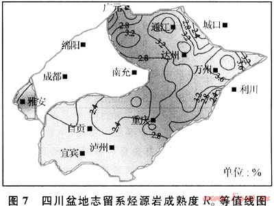 四川盆地下志留統(tǒng)泥質(zhì)烴源巖Ro值為2.2%~4.0%,已演化至過成熟階段。川南地區(qū)成熟度較低,普遍小于2.8%(圖7)。晚二疊世末,志留系源巖Ro值演化至0.9%,開始進(jìn)入成油期。三疊紀(jì)之后,由于沉積速度加快,志留系埋藏速率也相應(yīng)加快,志留系烴源巖在壓力和溫度作用下,熱演化加速。到中三疊世末時,很多地區(qū)的Ro值已迅速演化至1.3%。志留系烴源巖生成大量的液態(tài)烴。中侏羅世后,沉積作用仍然快速進(jìn)行,志留系地層仍處于快速埋藏狀態(tài),Ro值從1.3%迅速演化至2.2%,有機(jī)質(zhì)演化至高成熟期,處于濕氣轉(zhuǎn)化階段。從白堊系開始,大部分地區(qū)的志留系烴源巖有機(jī)質(zhì)R。值都超過了3%,進(jìn)入過成熟期,主要形成干氣。