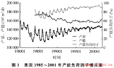從美國的產能和產量的歷史關系可以看出(圖1)[1],1995年之前,當產能負荷因子(產量與產能的比值)在65%~90%時,存在上游調峰,產量出現季節(jié)性的波動;1995年以后,產能負荷因子迅速提升,當大于90%以后,產量不再隨季節(jié)波動,2000年以后產量和產能曲線基本吻合,產能不再留有富余。調峰用氣量主要靠儲氣庫和進口的天然氣[2]。